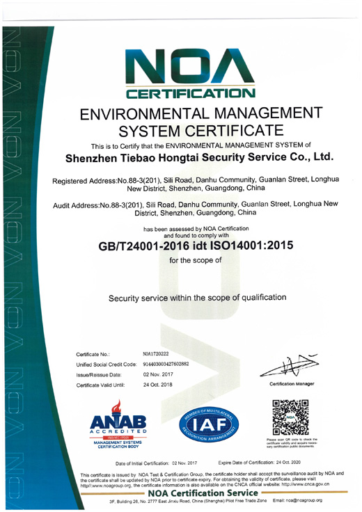 熱烈祝賀我司深圳市鐵保宏泰保安服務有限公司榮獲環境管理體系認證證書(英文版),GB/T24001-2016 idt ISO14001:2015 標準。認證范圍:資質范圍內保安服務。